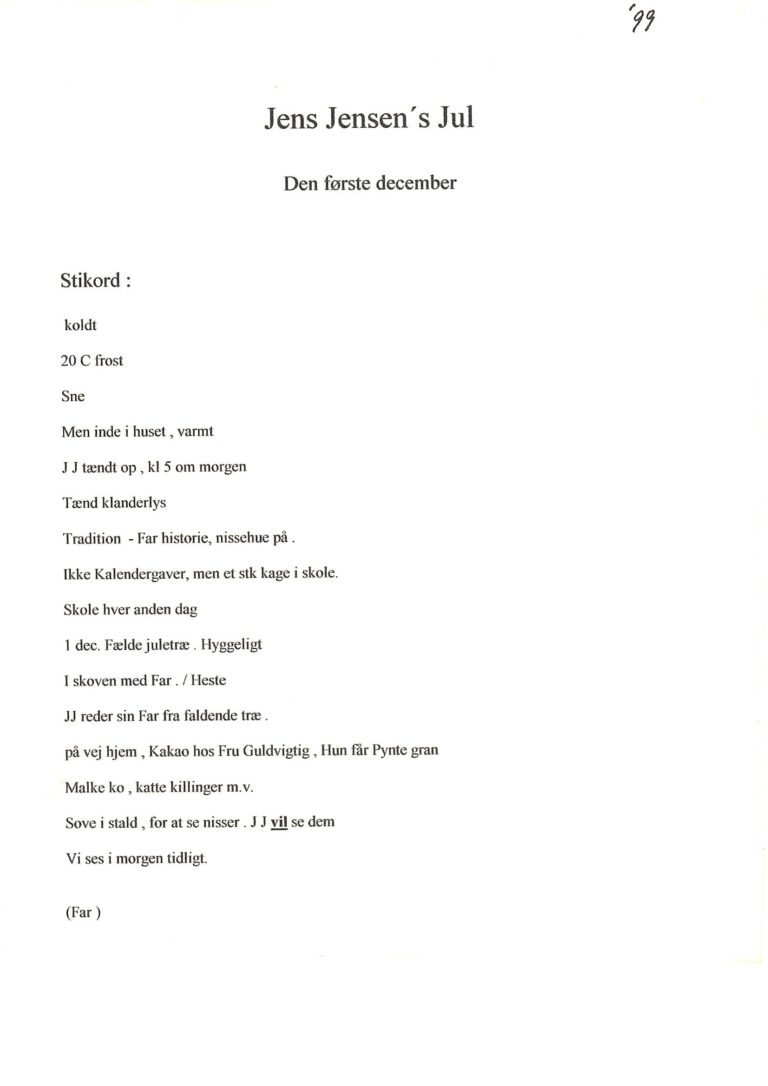 Hver julemorgen fra d. 1 dec. til d. 24 dec., sad vi ved morgenbordet med stearinlysene tændt, med morgenmad, kaffe i min kop og så digtet jeg en historie om Jens og hans families og deres jul. Det gjorde jeg i en hel del år og da mine børn blev teenager, lovede jeg at skrive historierne ned. De kunne, og kan stadig huske de fleste. Jens Jensen var i en klar erindring hos dem, og føltes som en del af deres barndom.